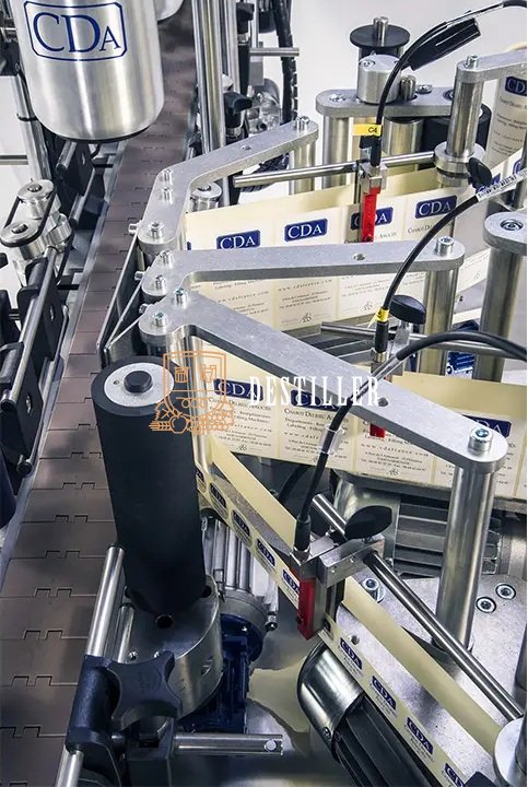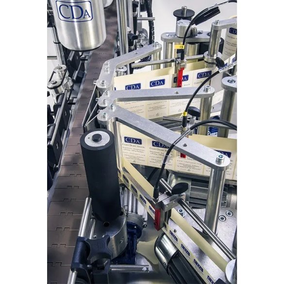 Crimping and labeling machine, up to 4 labels per bottle. The CDA Laa is an automatic labeling machine designed specifically for the needs of the wine industry. This versatile machine applies up to four labels to wine bottles, including front, back, neck, and medallion labels. It also dispenses and crimps metal and/or PVC caps.