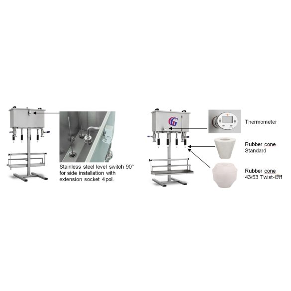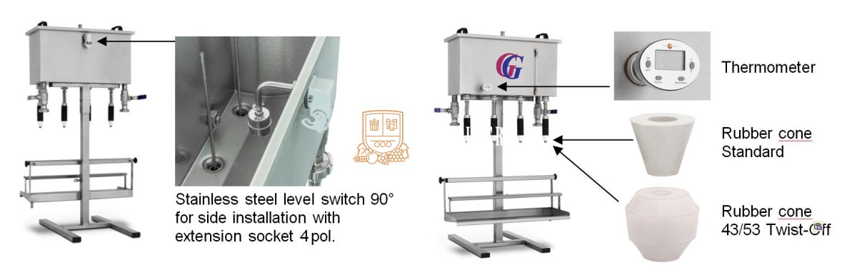 These bottle fillers are made entirely of stainless steel, which makes them hygienic and easy to clean. They are ideal for filling hot fruit juices and alcoholic beverages such as Bottling wines, schnapps, liqueurs. Depending on the liquid and bottle size, up to approx. 400 liters can be filled per hour. By changing the rubber cone, bottles with twist-off closures can also be filled.